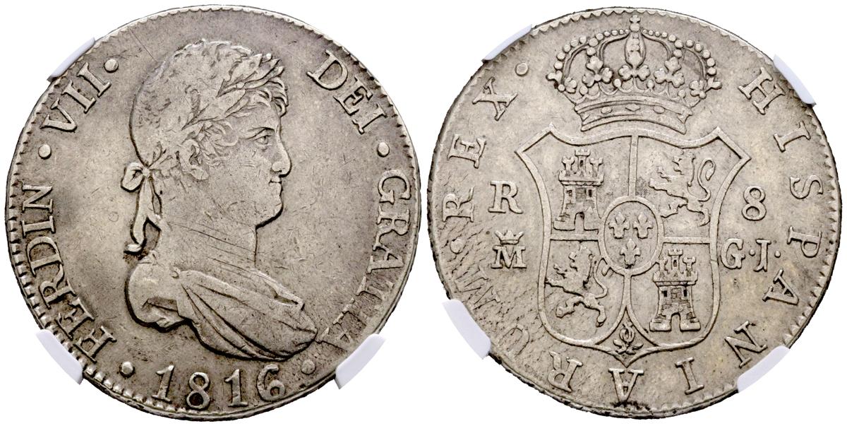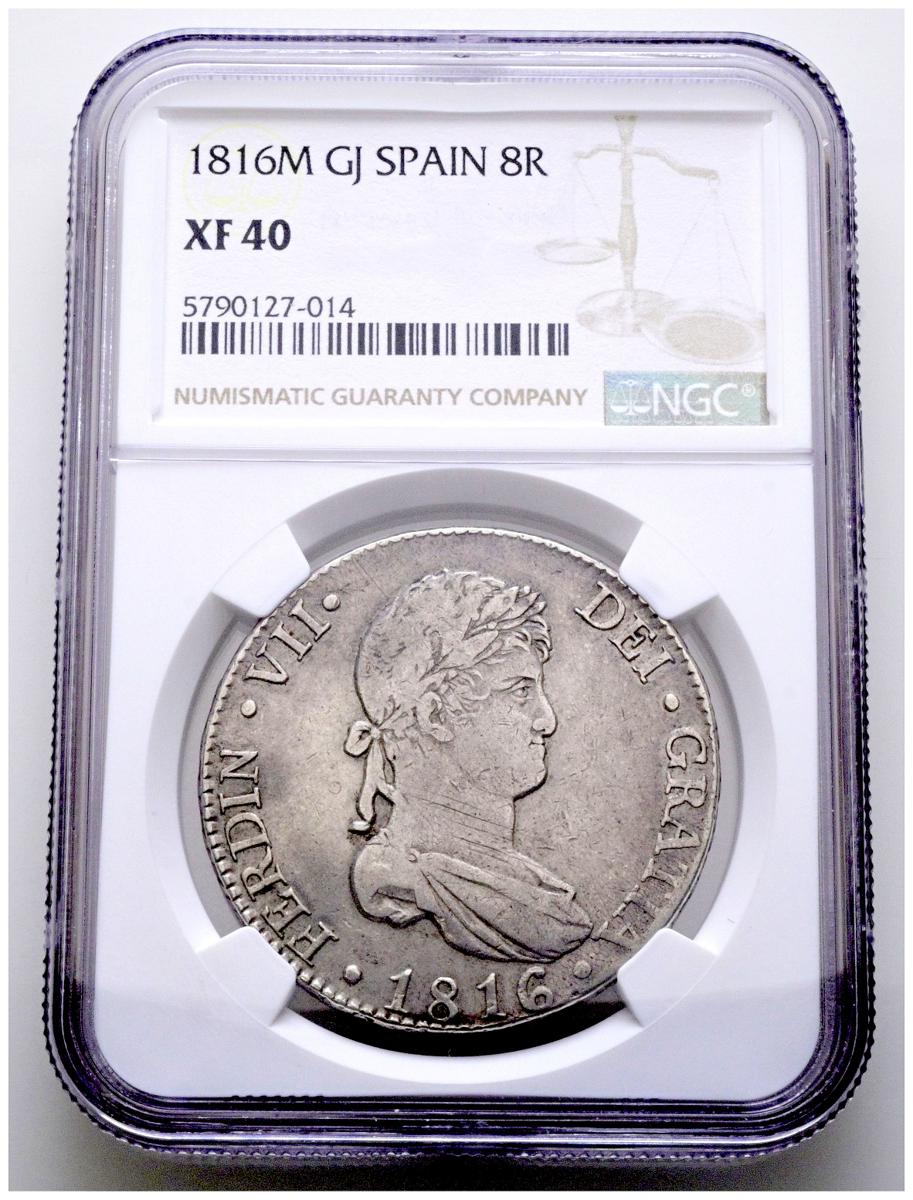 CARLOS III (1759-1788). 8 Reales (Ar. 27.00g/39mm)*. 1816. Madrid GJ. (Cal-2019-1270). Encapsulated by NGC XF 40. *Theoretical weight and measurements.
