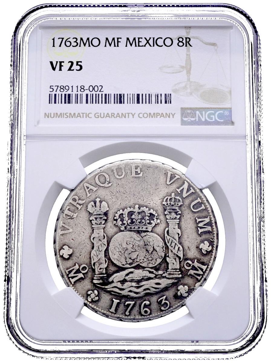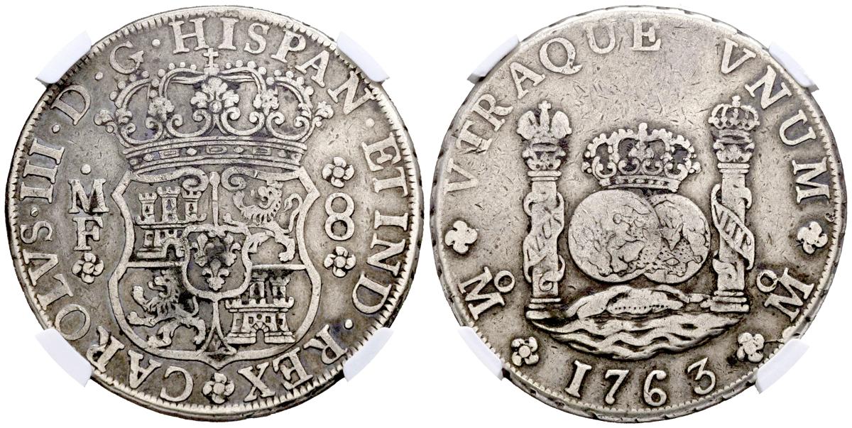 English CARLOS III (1759-1788). 8 Reales. (Ar. 27.00g/38mm)*. 1763. Mexico MF. (Cal-2019-1086). Encapsulated by NGC VF 25. Theoretical weight and measurements.