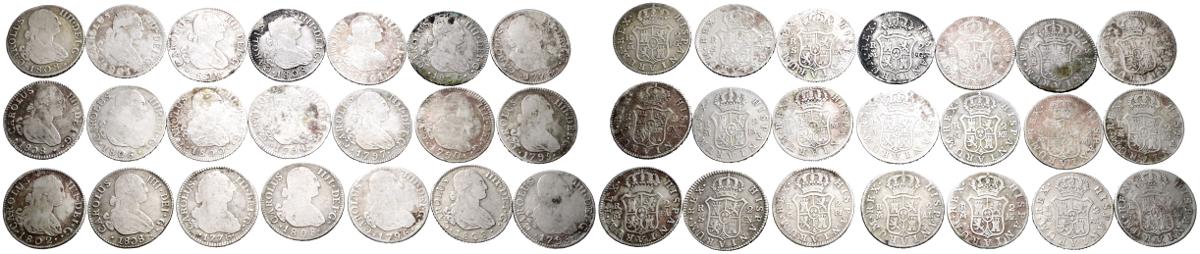 CARLOS IV (1788-1808). Interesting set of 21 peninsular 2 Reales coins (Madrid, 15, and Sevilla, 6) with a wide variety of minting dates. Different states of conservation. TO EXAMINE.