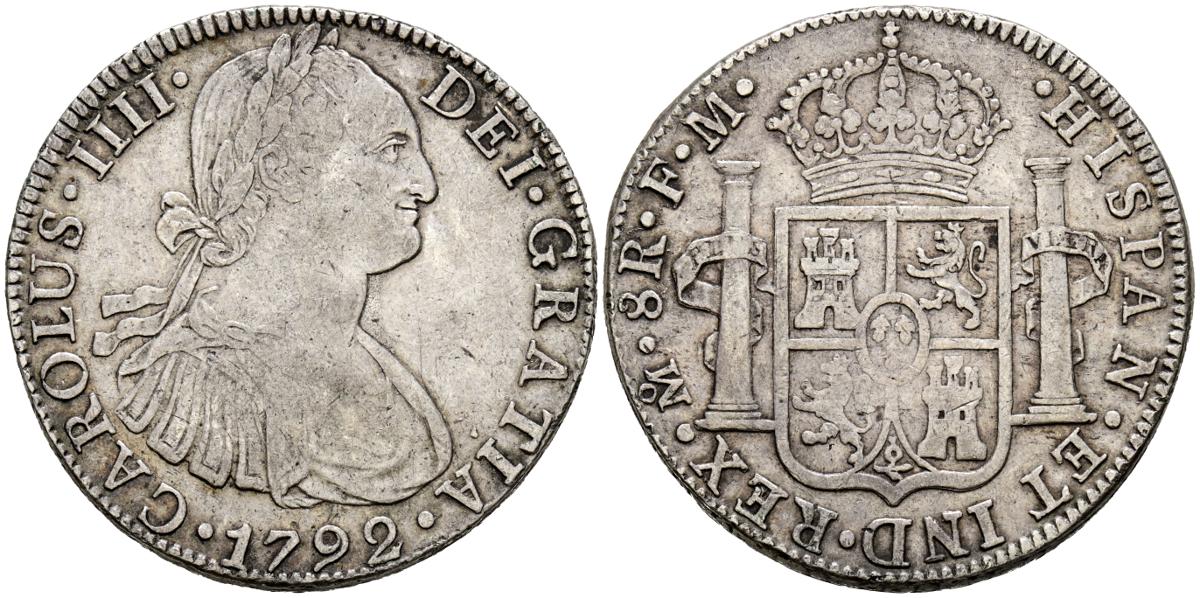 English CARLOS IV (1788-1808). 8 Reales. (Ar. 26.90g/39mm). 1792. Mexico FM. (Cal-2019-954). Very Fine.