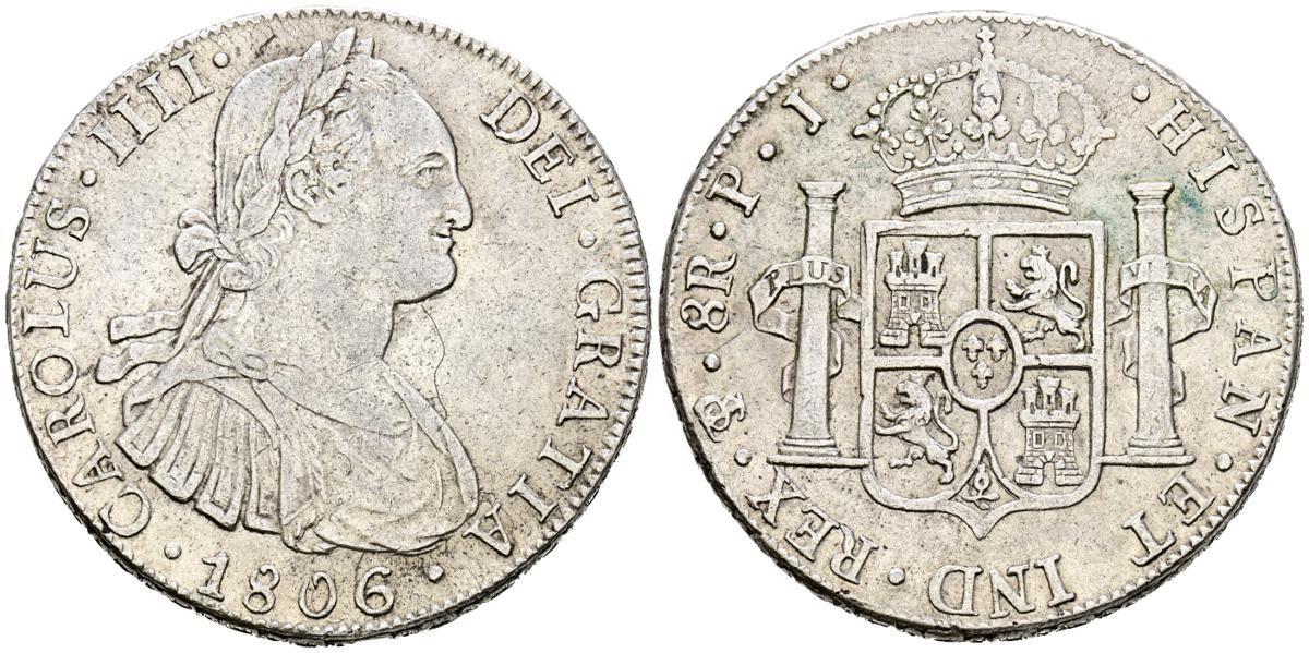 English CARLOS IV (1788-1808). 8 Reales (Ar. 26.98g/41mm). 1806. Potosí PJ. (Cal-2019-1012). Very Fine.