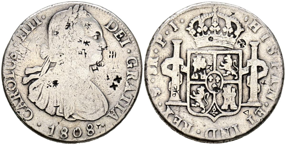 CARLOS IV (1788-1808). 8 Reales (Ar. 26.51g/41mm). 1808. Potosí PJ. (Cal-2019-1014). Good Fine. Numerous re-stamps.