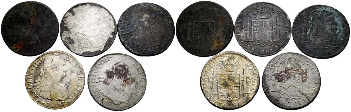 English CARLOS IV (1788-1808). Set consisting of 5 coins of 8 Reales from the mint of Mexico TH 1804 (2) and 1807 (2) and Guatemala M (1) dated 1806. Different states of conservation. Oxidations. TO EXAMINE.