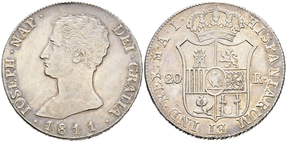 JOSEPH NAPOLEON (1808-1813). 20 Reales. (Ar. 26.82g/39mm). 1811. Madrid AI. Little eagle. (Cal-2019-41). Almost Extremely Fine. Remnants of original shine. Nice patina.