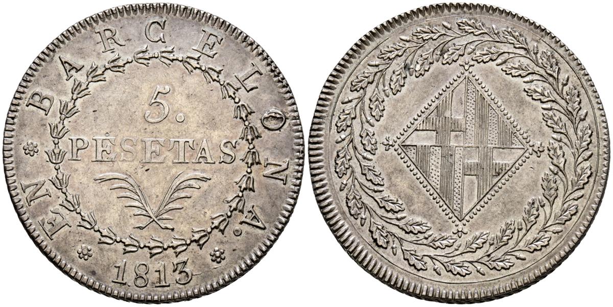 NAPOLEONIAN CATALONIA (1808-1814). 5 Pesetas. (Ar. 26.30g /40mm). 1813. Barcelona. (Cal-2019-52). Good Extremely Fine. Rare specimen and more in this beautiful quality maintaining a beautiful dark patina and traces of original shine.