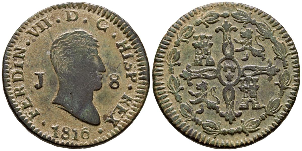 FERDINAND VII (1808-1833). 8 Maravedis. (Ae. 9.70g/30mm). 1816. Jubia. (Cal-2019-195). Naked bust. Very Fine.