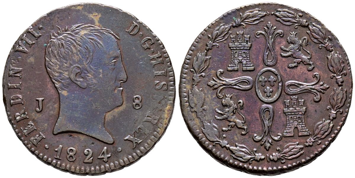 English FERDINAND VII (1808-1833). 8 Maravedis. (Ae. 9.77g/28mm). 1824. Jubia. Big-headed type. (Cal-2019-207). Good Very Fine. Scarce like that.