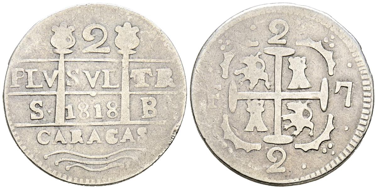 English FERDINAND VII (1808-1833). 2 Reales. (Ar. 4.93g/24mm). 1818. Caracas SB. Assayers' initials exchanged. Lions and castles. (Cal-2019-730). Realistic coinage with F-7. Almost Very Fine. Limited.