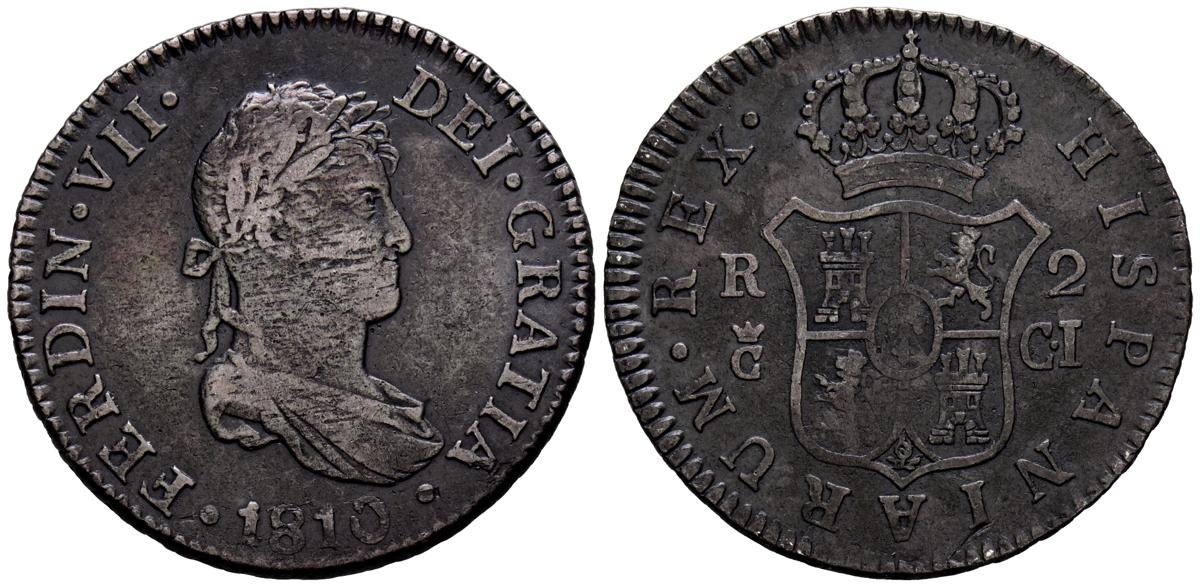 English FERDINAND VII (1808-1833). 2 Reales. (Ar. 5.83g/27mm). 1810. Cádiz CI. (Cal-2019-723). Small mint mark. Almost Very Fine.