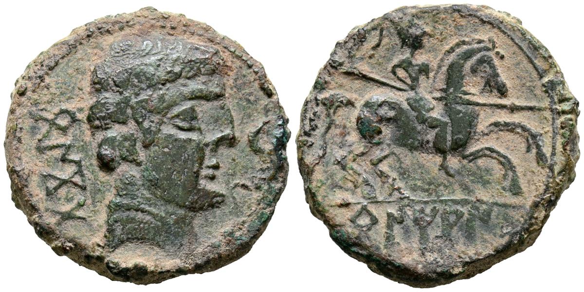 English BENTIAN (Navarra Zone). As. (Ae. 9.90g/26mm). 120-80 BC (FAB-250). Anv: Male head on the right, behind Iberian legend: BeNCoDa, in front dolphin. Rev: Rider with sword to the right, below Iberian legend: BeNTiAN. Almost Very Fine. Scarce.