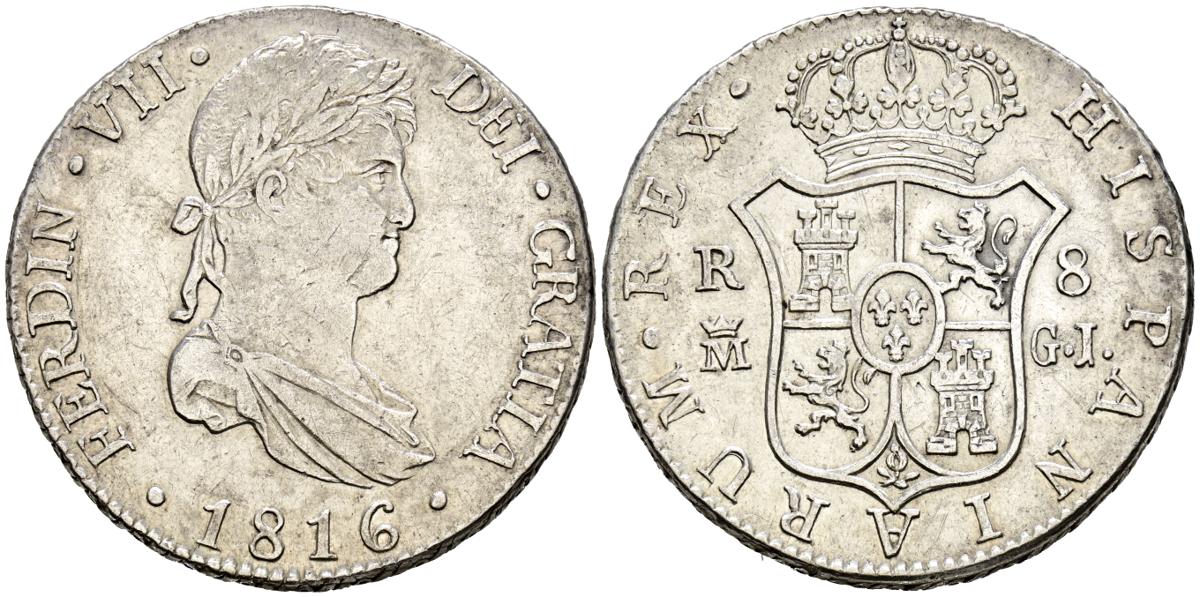 English FERDINAND VII (1808-1833). 8 Reales. (Ar. 26.88g/38mm). 1816. Madrid GJ. (Cal-2019-1270). Almost Extremely Fine.