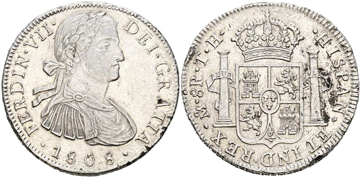 FERDINAND VII (1808-1833). 8 Reales. (Ar. 26.86g/40mm). 1808. Mexico TH. imaginary bust. (Cal-2019-1306). Almost Extremely Fine. Cleaned. Beat on edge.