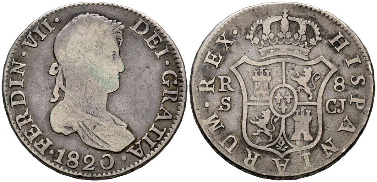 FERDINAND VII (1808-1833). 8 Reales. (Ar. 26.57g/39mm). 1820. Sevilla CJ. (Cal-2019-1421). Laureate bust. Almost Very Fine.