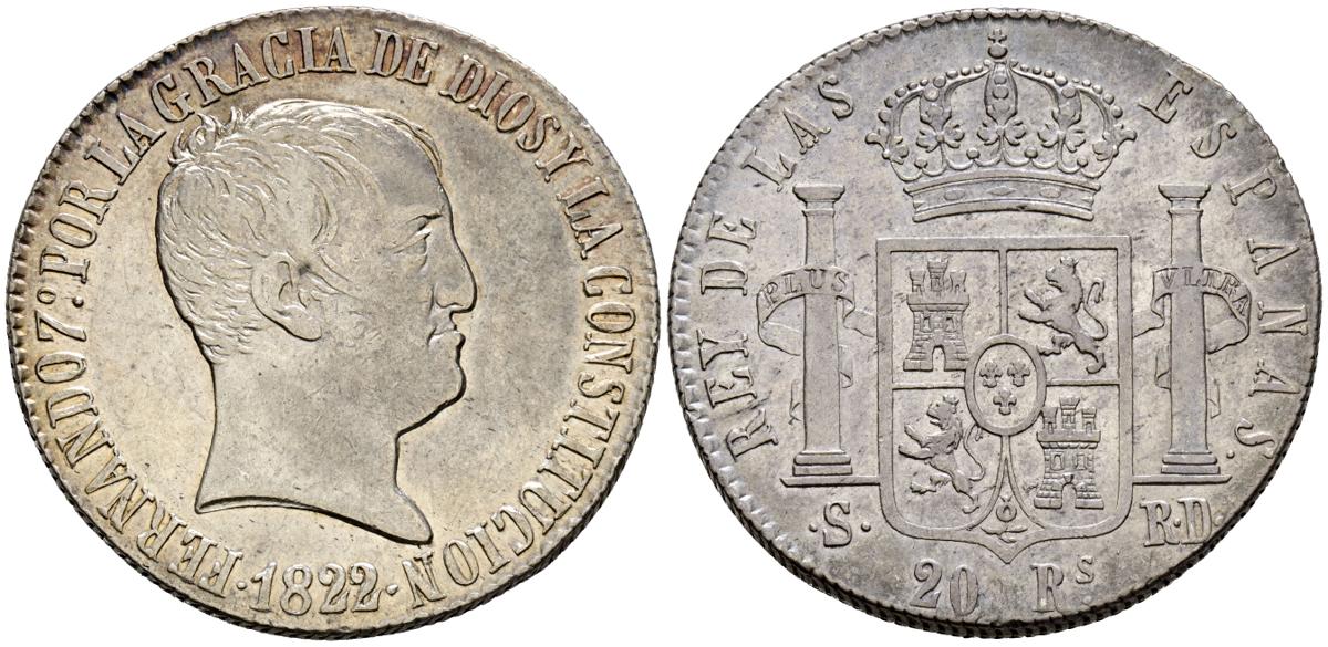 FERDINAND VII (1808-1833). 20 Reales. (Ar. 26.96g/38mm). 1822. Sevilla DR. (Cal-2019-1422). Extremely Fine. Scarce and more so.