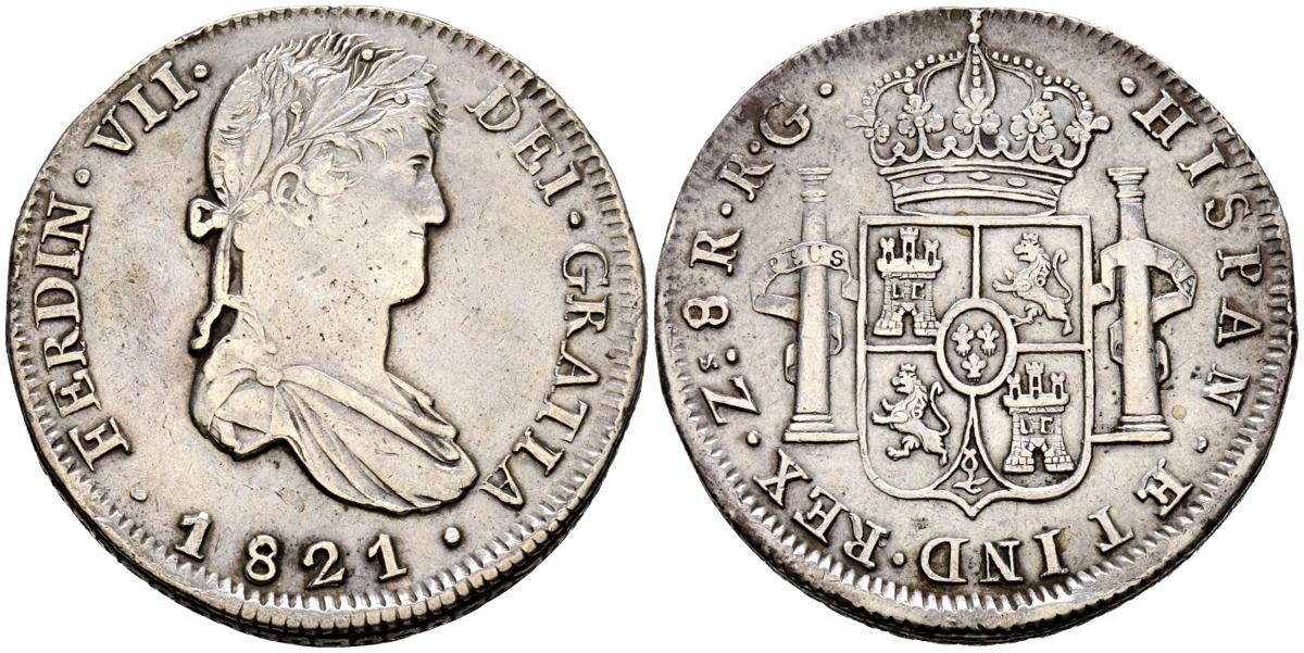 English FERDINAND VII (1808-1833). 8 Reales. (Ar. 27.64g/39mm). 1821. Zacatecas RG. (Cal-2019-1465). Good Very Fine. Cleaned.