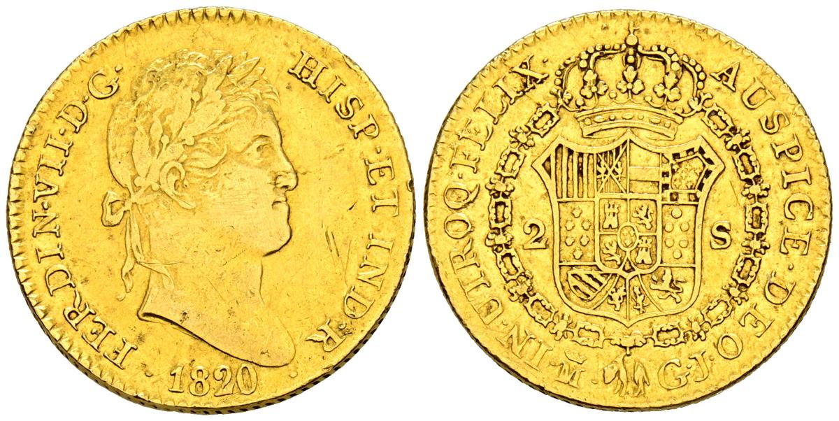 English FERDINAND VII (1808-1833). 2 Escudos. (Au 6.74g/21mm). 1820. Madrid GJ. (Cal-2019-1628). Almost Very Fine/ Very Fine.
