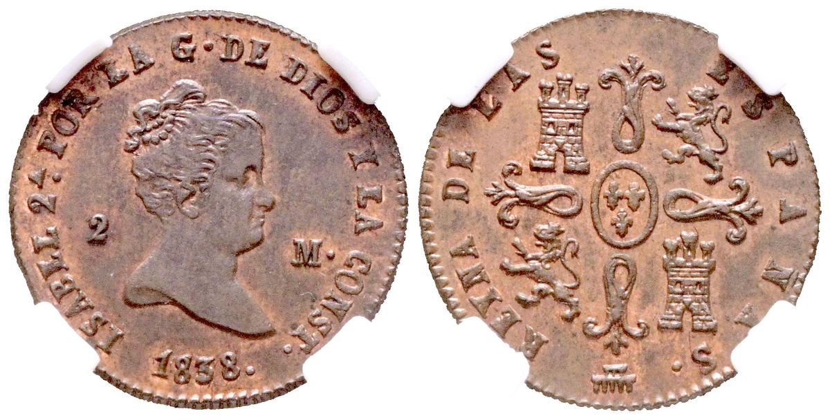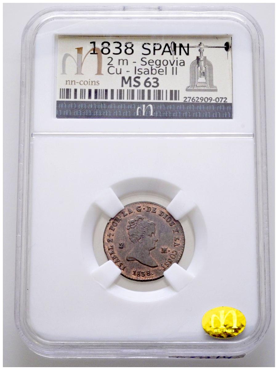 ELIZABETH II (1833-1868). 2 Maravedís (Ae. 2.50g/19mm)*. 1838. Segovia. (Cal-2019-49). Encapsulated by NN Coins. MS 63. * Theoretical weight and measurements.