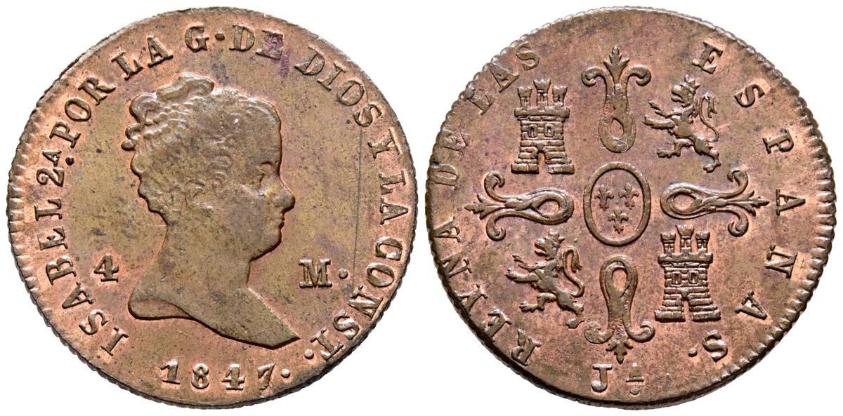ELIZABETH II (1833-1868). 4 Maravedis. (Ae. 4.52g/23mm). 1847. Jubia. (Cal-2019-73). Extremely Fine. Die break on obverse. Original Luster .