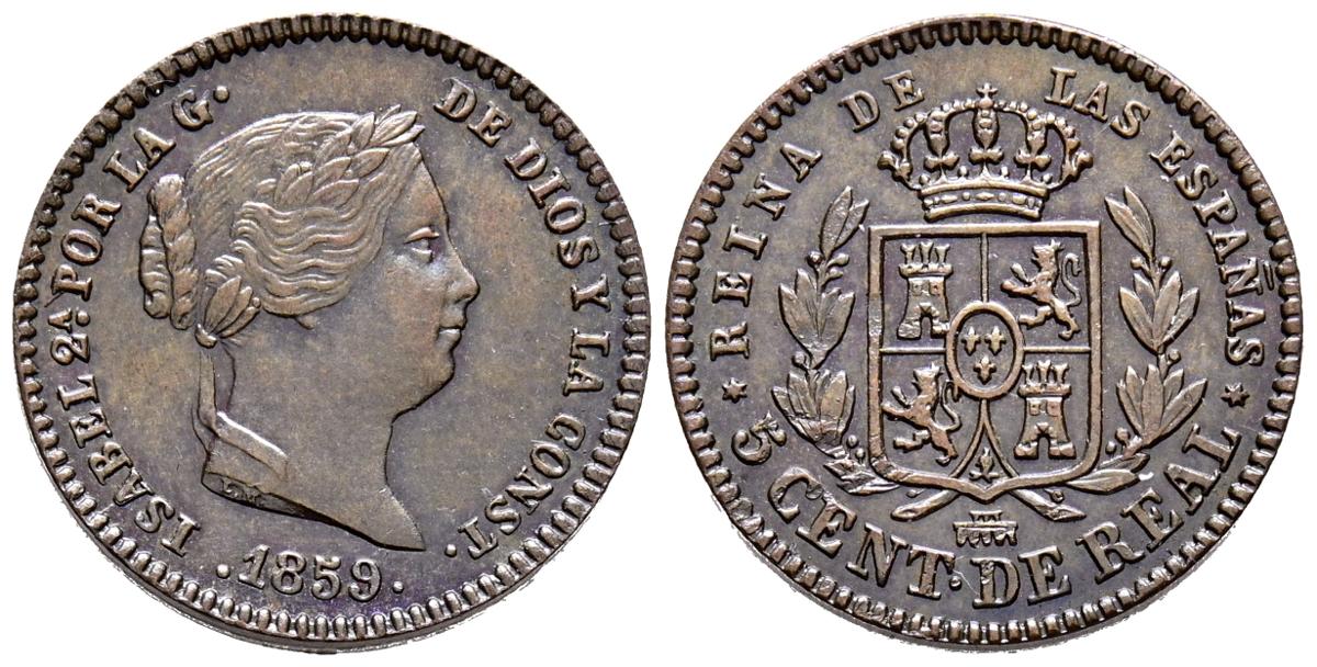 ELIZABETH II (1833-1868). 5 Céntimos de Real. (Ae. 2.05g/17mm). 1859. Segovia. (Cal-2019-161). Extremely Fine. Patina.