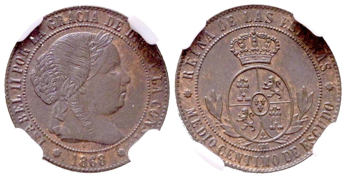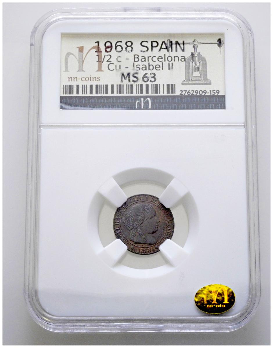 ELIZABETH II (1833-1868). 1/2 Céntimo de Escudo. (Ae. 1.25g /16mm)*. 1868. Barcelona OM. (Cal-2019-201). Encapsulated by NN Coins MS 63. *Theoretical weight and measurements.