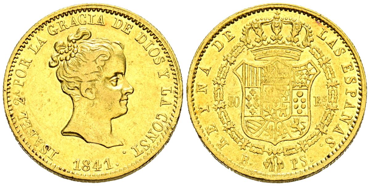 ELIZABETH II (1833-1868). 80 Reales. (Au. 6.72g/21mm). 1841. Barcelona PS. (Cal-2019-707). Good Very Fine.