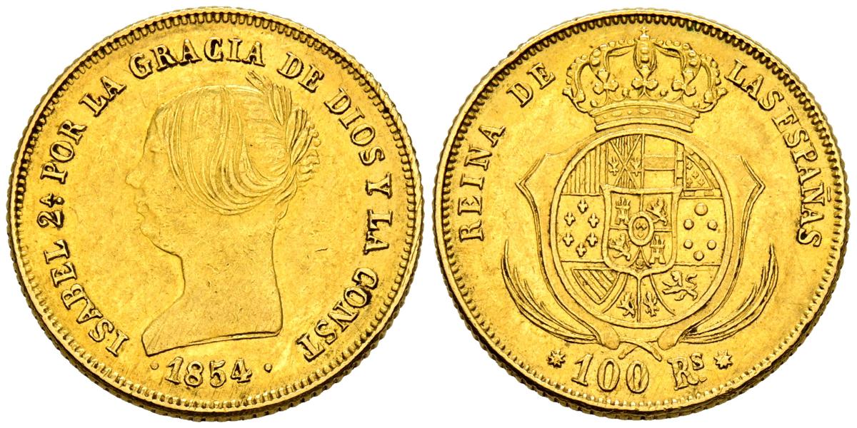 ELIZABETH II (1833-1868). 100 Reales. (Au. 8.35g/22mm). 1854. Barcelona. (Cal-2019-762). Very Fine.