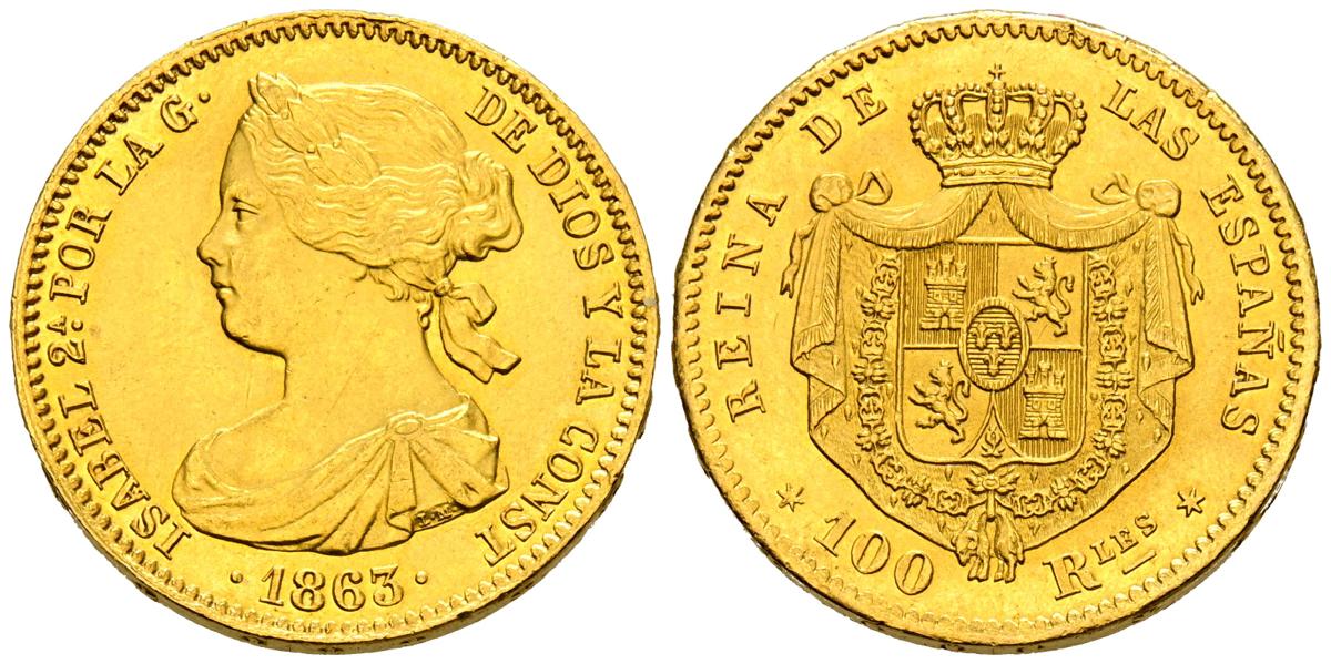 ELIZABETH II (1833-1868). 100 Reales. (Au. 8.34g/22mm). 1863. Madrid. (Cal-2019-790). Good Extremely Fine. Original Luster .