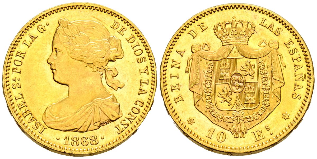 English ELIZABETH II (1833-1868). 10 Escudos. (Au. 8.44g/22mm). 1868 *18-68. Madrid. (Cal-2019-815). Good Extremely Fine. Nice specimen.