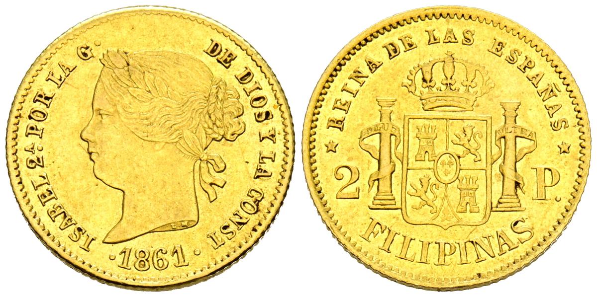 ELIZABETH II (1833-1868). 2 pesos. (Au. 3.36g/18mm). 1861/0. Manila. (Cal-2019-835). Good Very Fine.