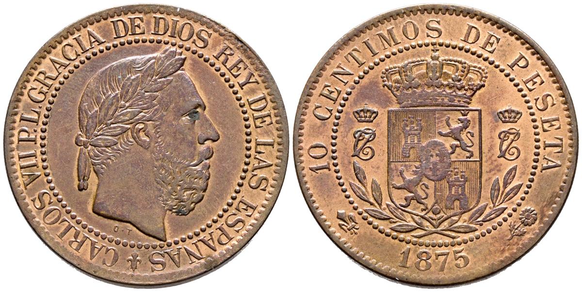 CARLOS VII (1868-1909). 10 Cents. (Ae. 10.01g/30mm). 1875. Oñate. (Cal-2019-5). Almost Extremely Fine. Nice piece.