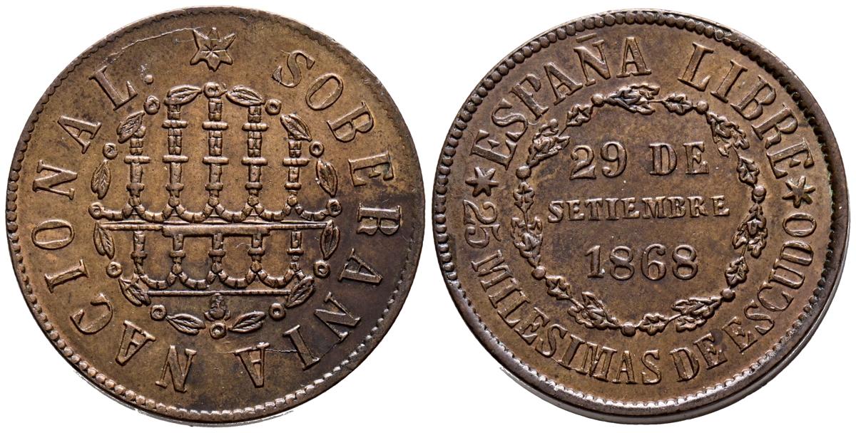 PROVISIONAL GOVERNMENT (1868-1871). 25 Thousandths of a Escudo (Ae. 6.69g/25mm). 1868. Segovia. Good Extremely Fine. Beautiful original shine. Scarce and more so in this quality.