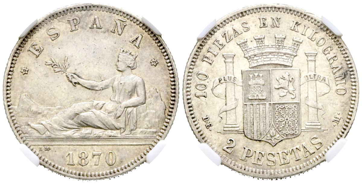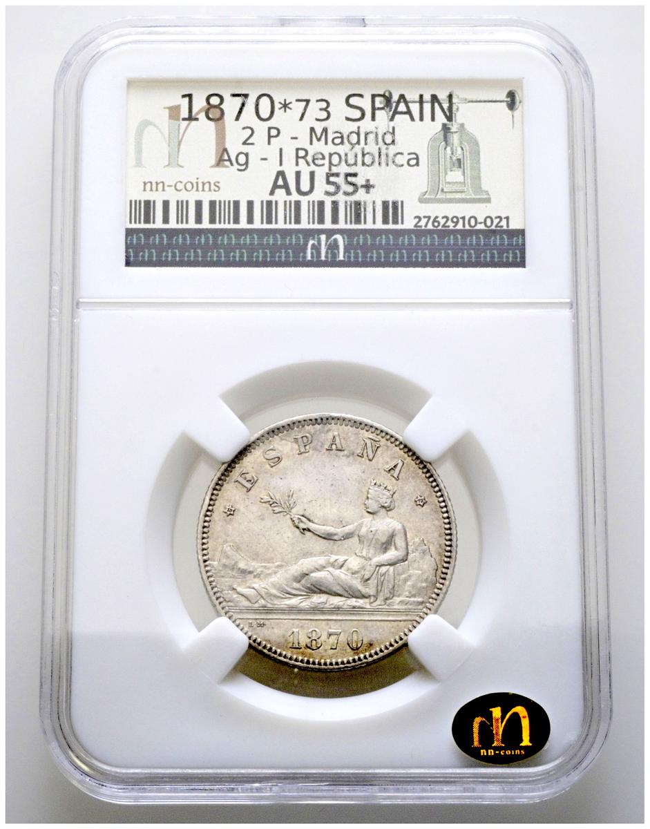 PROVISIONAL GOVERNMENT (1868-1871). 2 Pesetas. (Ar. 10.00g/27mm)*. 1870 *18-73. Madrid DEM. (Cal-2019-31). Encapsulated by NN Coins AU 55+. Theoretical weight and measurements.