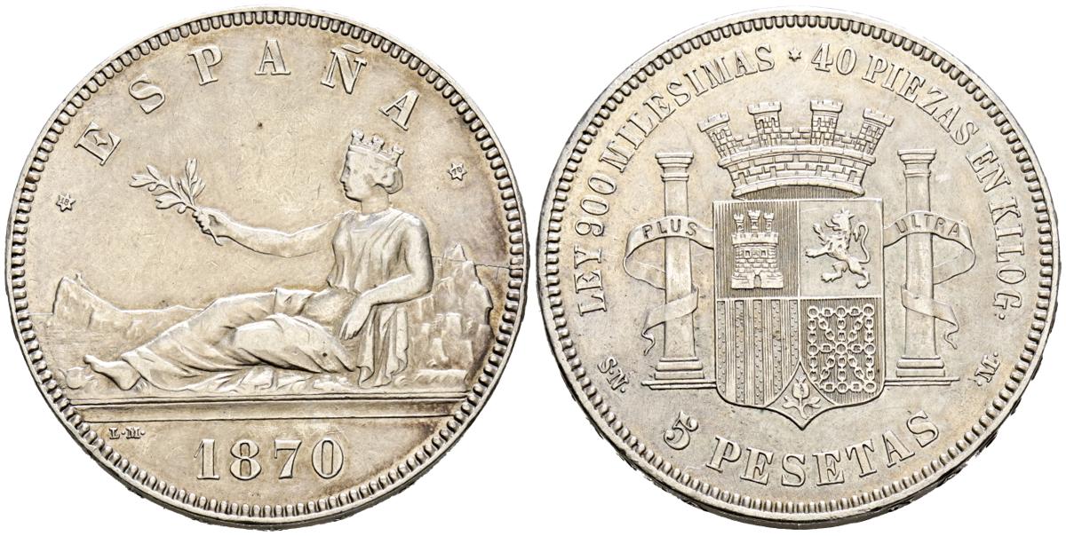 English PROVISIONAL GOVERNMENT (1868-1871). 5 Pesetas. (Ar. 24.83g/37mm). 1870 *18-70. Madrid SNM. (Cal-2019-39). Good Very Fine.