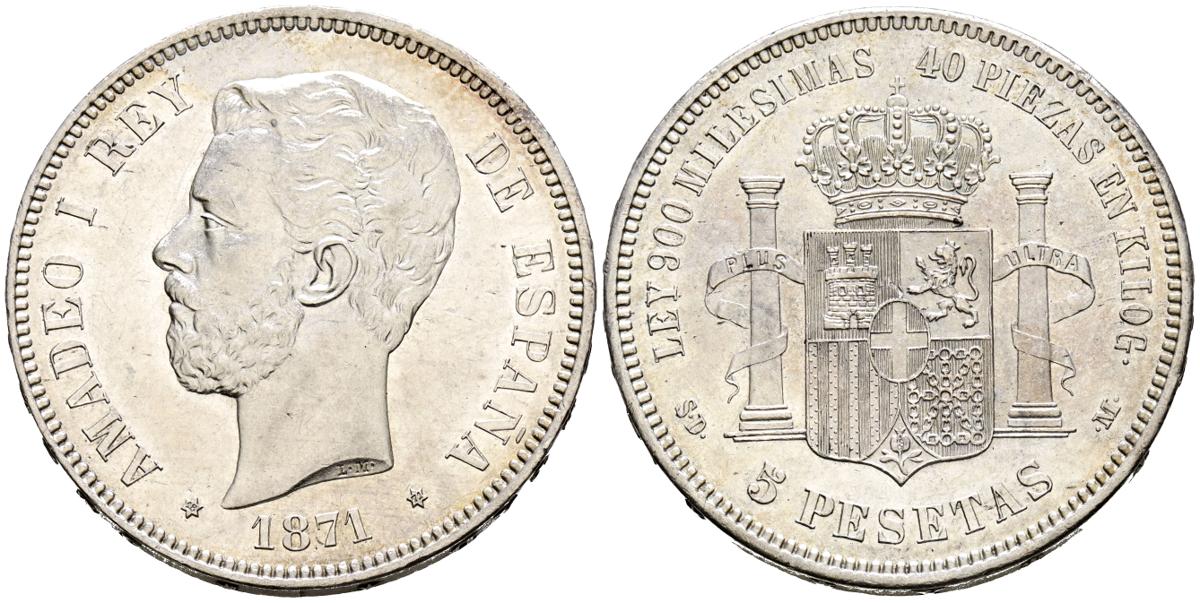 AMADEO I (1871-1873). 5 Pesetas. (Ar. 24.87g/37mm). 1871 *18-71. Madrid SDM. (Cal-2019-1). Extremely Fine. scratch scratches and marks.