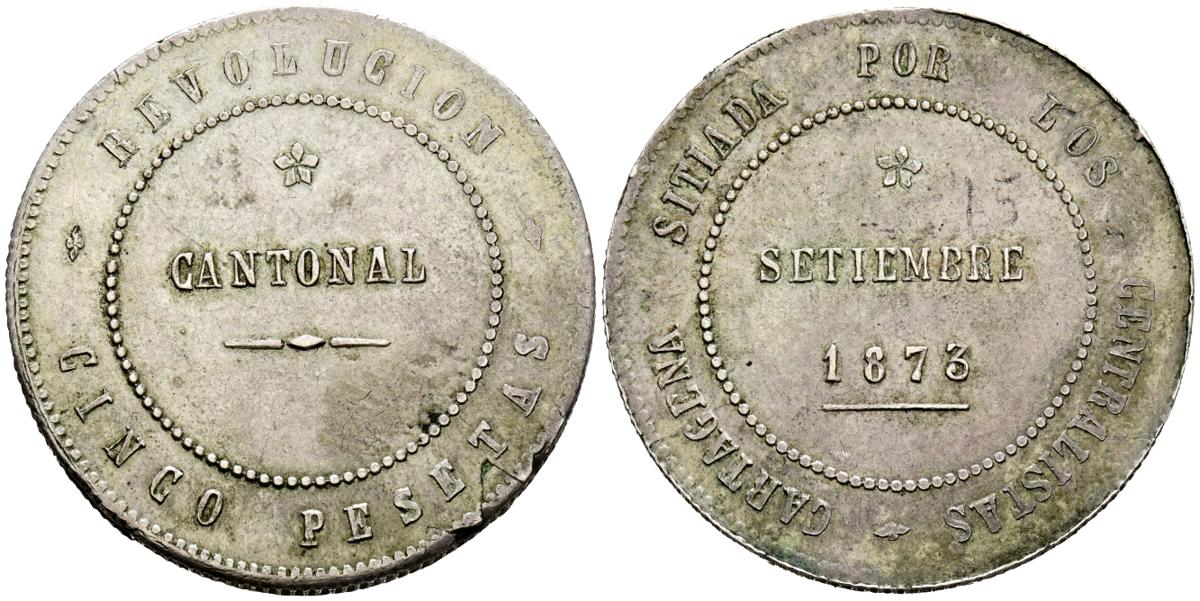 English CANTONAL REVOLUTION (1873-1874). 5 Pesetas. (Ar. 26.41g/37mm). 1873. Cartagena. (Cal-2019-11). 86 pearls on obverse and 90 on mismatched reverse. Almost Very Fine