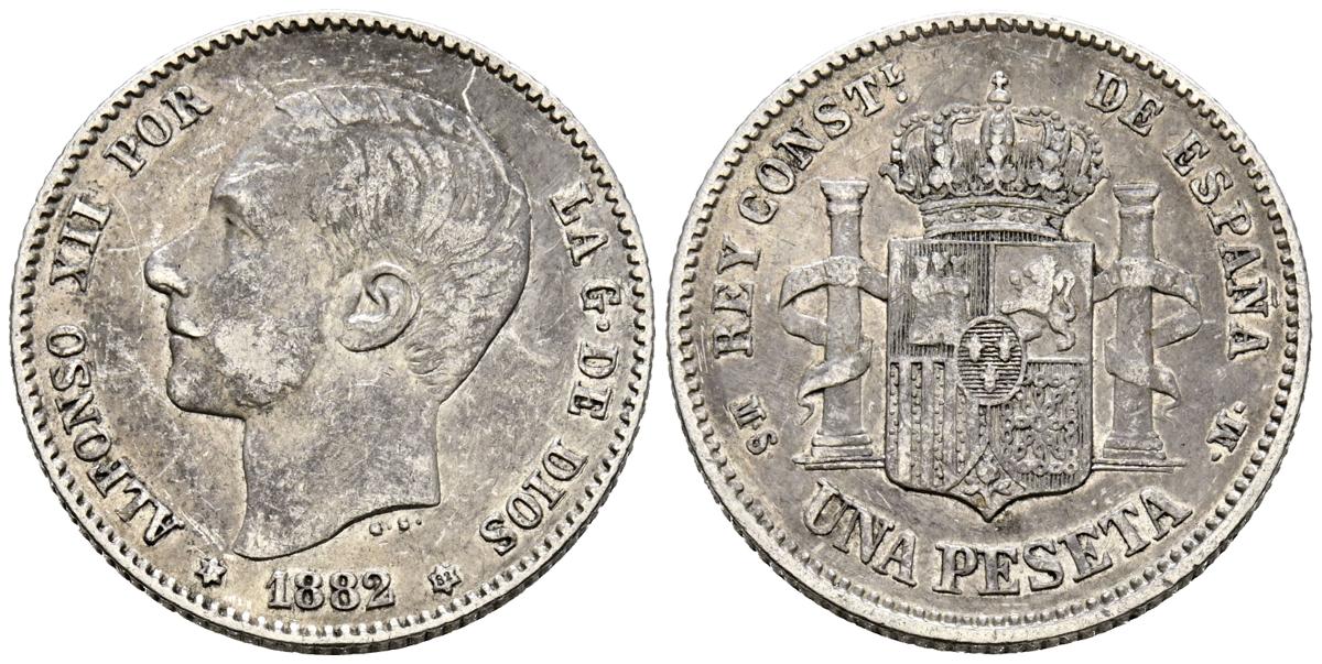 English ALFONSO XII (1874-1885). 1 Peseta. (Ar. 4.91/23mm). 1882 *18-82. Madrid MSM. (Cal-2019-20). Almost Very Fine. First star partially visible. Limited.
