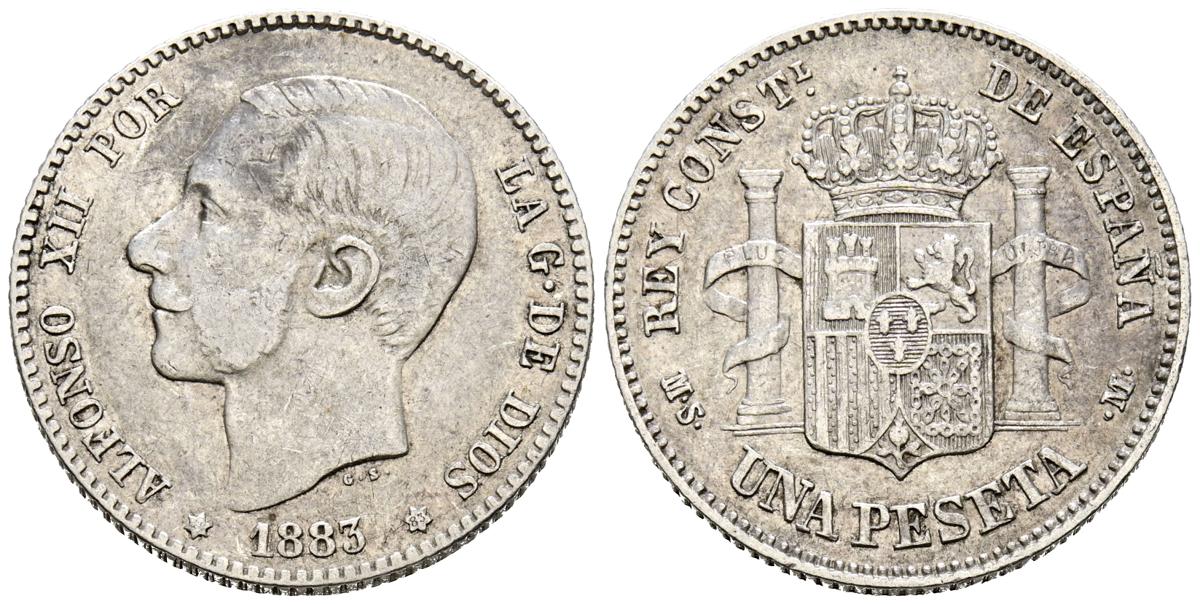 ALFONSO XII (1874-1885). 1 Peseta (Ar. 4.96g/23mm). 1883 *18-83. Madrid MSM. (Cal-2019-21). Almost Very Fine. First star partially visible.
