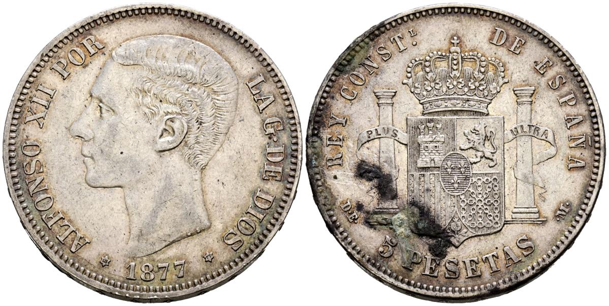 ALFONSO XII (1874-1885). 5 Pesetas. (Ar. 25.03/37mm). 1877 *18-77 . Madrid DEM. (Cal-2019-38). Good Very Fine/ Very Fine. Oxidations on reverse.