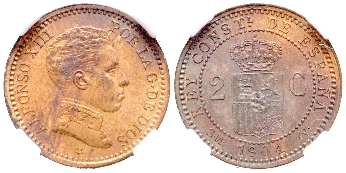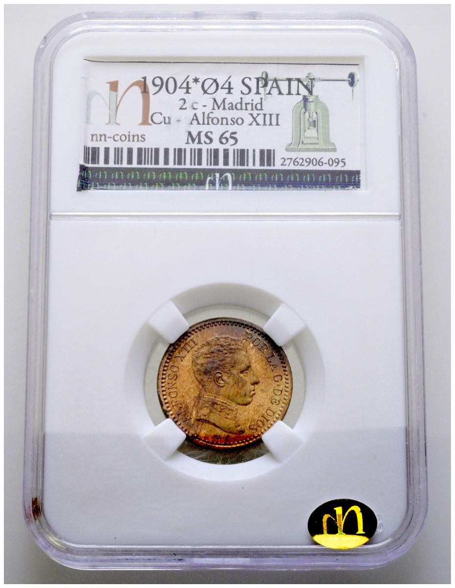 English ALFONSO XIII (1885-1931). 2 Cents. (Ae. 2.00g/20mm)*. 1904 *04. Madrid SMV. (Cal-2019-6). Encapsulated by NN Coins. MS 65. * Theoretical weight and measurements.