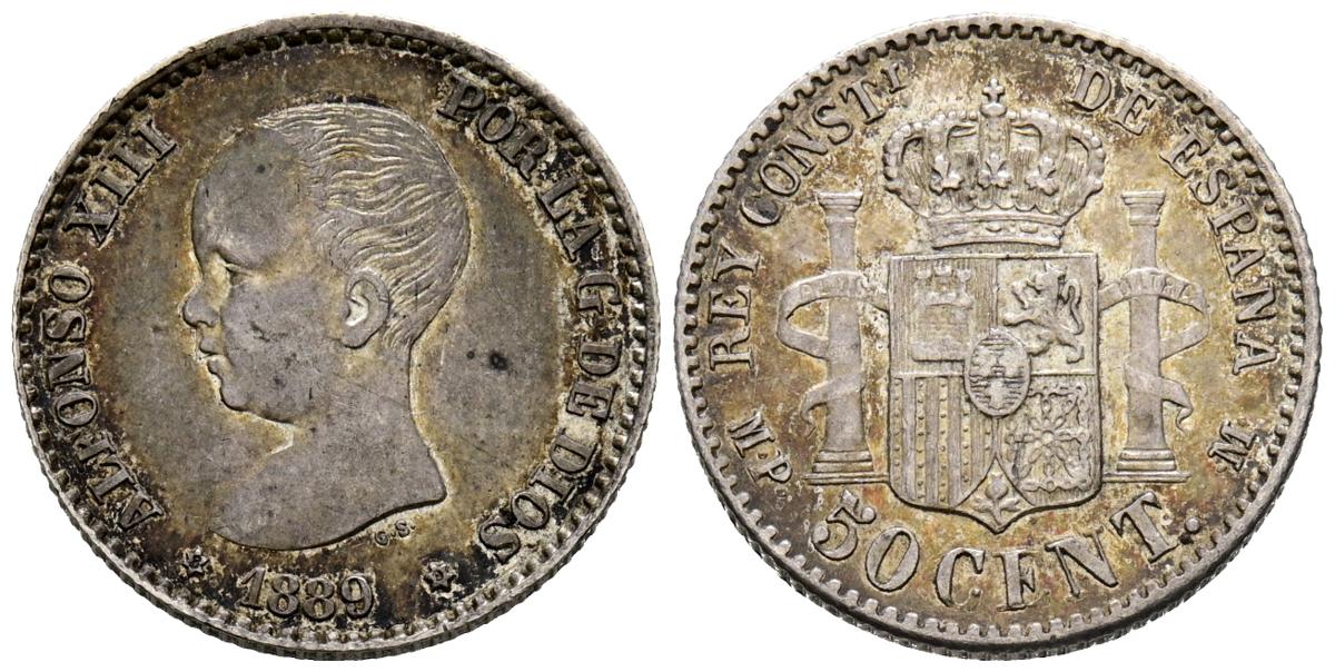 ALFONSO XIII (1885-1931). 50 Cents. (Ar. 2.49g/18mm). 1889 *8-9. Madrid MPM. (Cal-2019-27). Almost Extremely Fine. Iridescent tone.