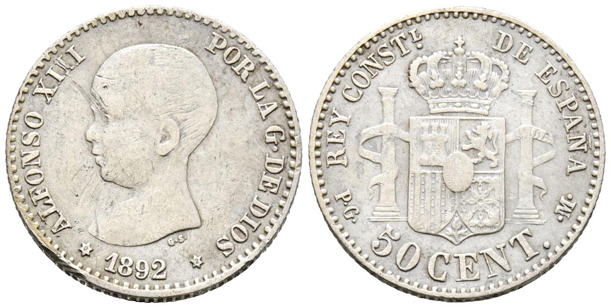 ALFONSO XIII (1885-1931). 50 Cents. (Ar. 2.47g/18mm). 1892 *9-2. Madrid PGM. (Cal-2019-38). Good Very Fine.