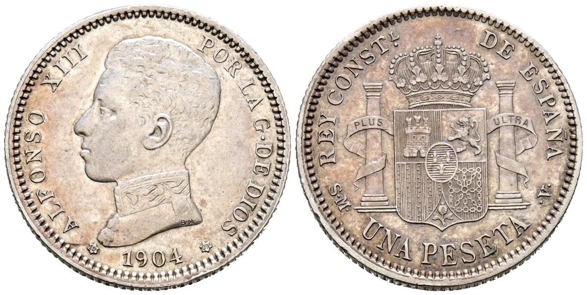 ALFONSO XIII (1885-1931). 1 peseta. (Ar. 4.95g/23mm). 1904* 19-04. Madrid SMV. (Cal-2019-68). Extremely Fine.