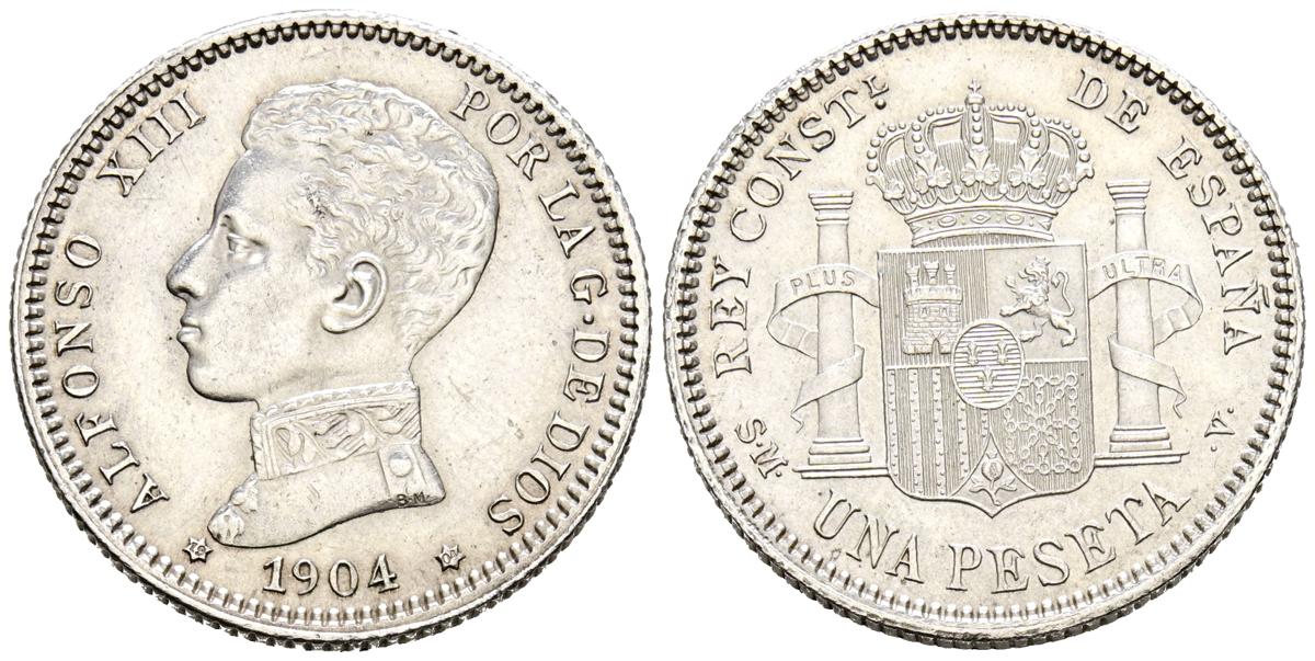 ALFONSO XIII (1885-1931). 1 Peseta. (Ar. 5.01g/23mm). 1904 * 19-04. Madrid SMV. (Cal-2019-68). Extremely Fine. Cleaned.