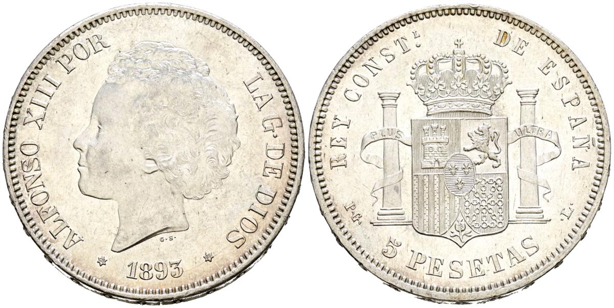 ALFONSO XIII (1885-1931). 5 Pesetas. (Ar. 25.03g/37mm). 1893 *18-93. Madrid PGL. (Cal-2019-102). Extremely Fine. Cleaning Scratch . Remnants of original shine.