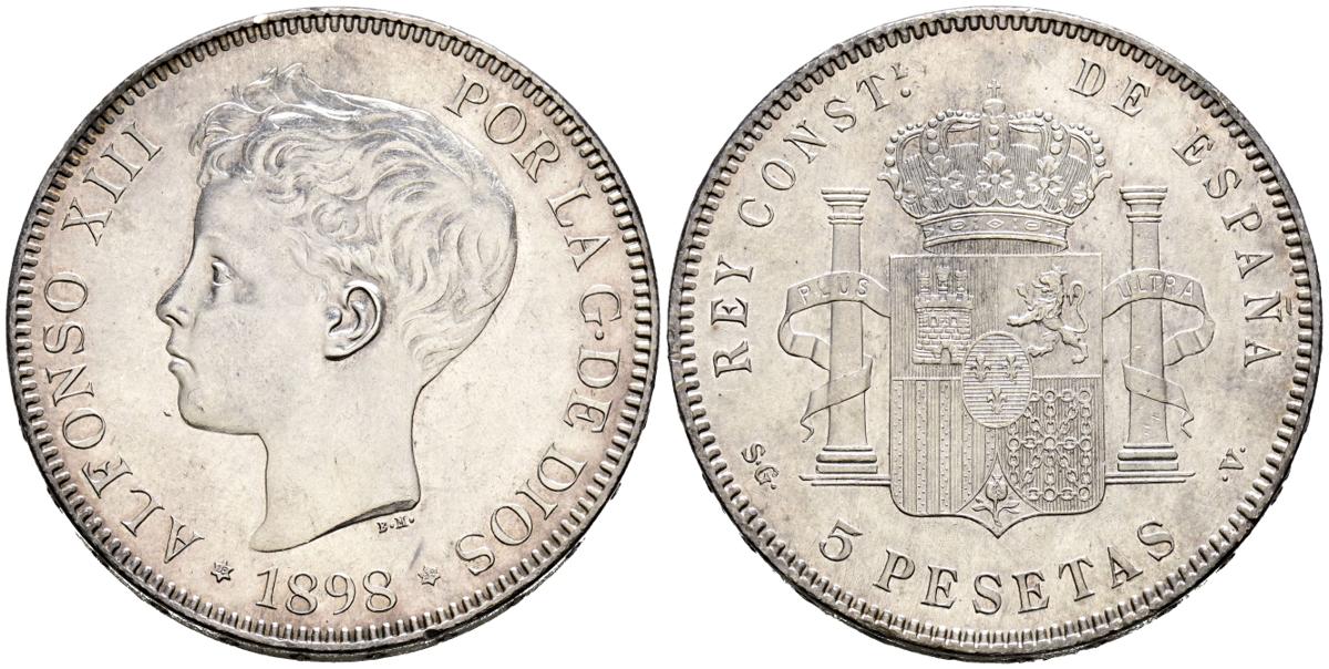 ALFONSO XIII (1885-1931). 5 Pesetas. (Ar. 25.02g/37mm). 1898 *18-98. Madrid SGV. (Cal-2019-109). Almost Uncirculated. Scratch on obverse. Magnificent specimen.