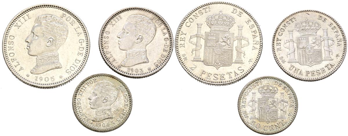 ALFONSO XIII (1885-1931). Beautiful set of 3 silver values of 50 Céntimos (1904), 1 Peseta (1903) and 2 Pesetas (1905). Extraordinary level of conservation of the 3 pieces. Natural Luster . TO EXAMINE.
