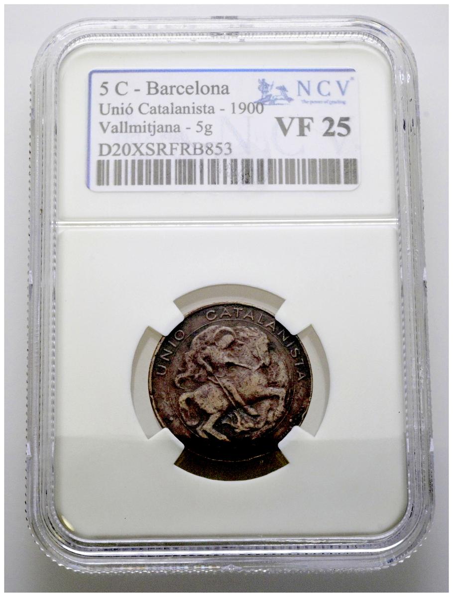 ALFONSO XIII (1885-1931). 5 Cents. (Ae. 5.00g/24mm). 1900. Barcelona (Catalan Union). (Cal-2019-132). Encapsulated by NCV. VF 25. *Theoretical weight and measurement.