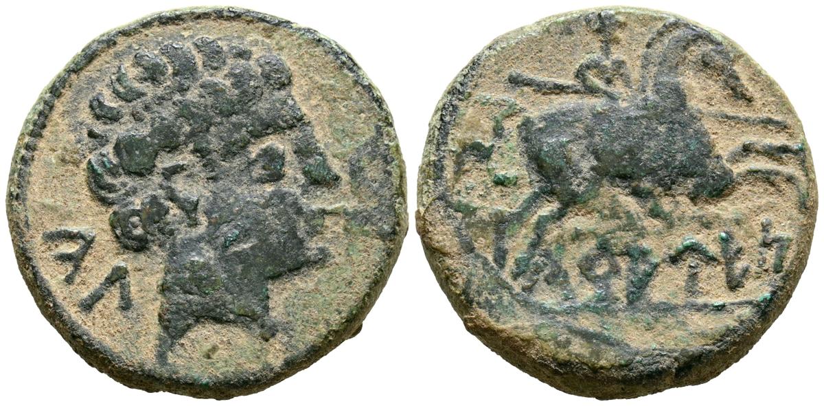CARAUES (Magallón, Zaragoza). As. (Ae. 10.38g/24mm). 120-80 BC (FAB-438). Anv: Male head to the right, behind letters: CaL, in front dolphin. Rev: Rider with spear to the right, below Iberian legend: CaRAUES. Almost Very Fine. Rare specimen.