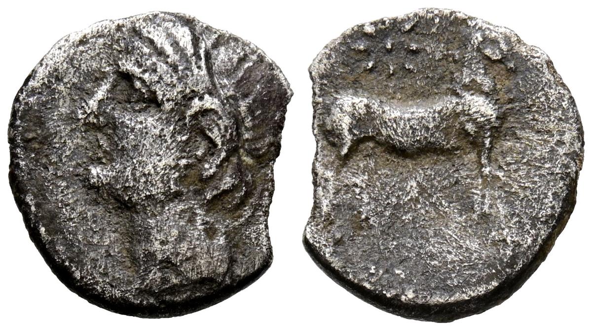 CARTAGONOVA (Cartagena, Murcia). 1/4 Shekel. (Ar. 1.74g/15mm). 220-215 BC (FAB-495). Anv: Head of Tanit to the left. Rev: Horse standing on the right, star above. Almost Very Fine. Scarce. Missing blank.
