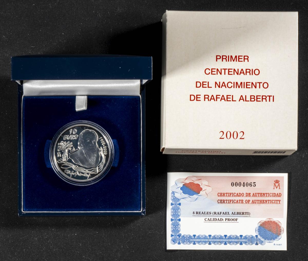 English JUAN CARLOS I (1975-2014). 10 Euros (Ar. 27.00g/40mm). I Centenary of the Birth of Rafael Alberti. 2002. FNMT PROOF. Includes original case and certificate of authenticity. Print run of 25,000 units.